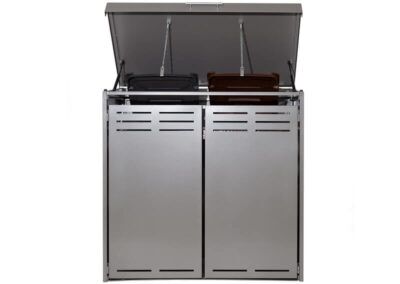 Die Abfallboxen bieten extra großes Volumen und extra viel Komfort. Die Verarbeitung aus hochfestem Aluminium garantiert eine lange Haltbarkeit. Der Komfort der Mülltonnenbox besticht durch die integrierte Öffnungsautomatik. BIG WASTY & LITTLE LITTER sind in über 250 Farben erhältlich und in 2 verschiedenen Varianten. Die beiden Varianten sind unterschiedlich ausgeführt. Nicht nur die Abmessungen differieren leicht, sondern auch die Öffnungsmöglichkeiten. Während die eine Variante 2 Flügeltüren besitzt, wird die andere bequem mittels einer Öffnungsautomatik geöffnet. In beide Varianten passen 2 Mistkübel.