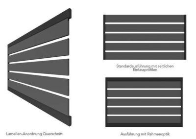 Um einen wuchtigeren Eindruck zu erzeugen gibt es dazu größere Standardlatten. Damit der Zaun blickdicht ist, kann man den Abstand zu den Latten auch verringern. Es sind keine Schrauben sichtbar und es ist ein 4-seitiger Rahmen machbar. Im gleichen Design wie der Zaun sind Gehtüren, Zweiflügeltore und Schiebetore montierbar.