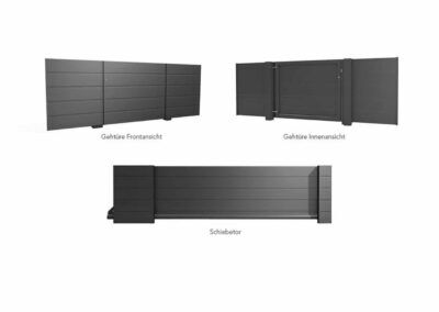 Gehtüren, Zweiflügeltore und Schiebetore im gleichen Design erhältlich.